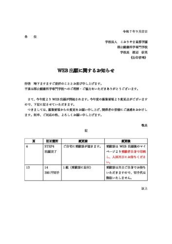 資料請求 お問い合わせ アクセス 日本語を学びたい方へ 在校生の方へ 卒業生の方へ 採用ご担当の方へ 入札情報について 保護者の方へ 学校案内Introduction 郡山健康科学専門学校について 学校概要 学校長挨拶 本校の特長 沿革 アクセス SDGsへの取り組み 学校案内 施設案内 国際交流センター 生涯学習センター 情報公開・学校報 学校基本情報 学校報 学科紹介Department 入学案内Admission オープンキャンパス等 オープンキャンパス 学校見学・進路相談 入試・選考 入学試験について 募集要項 学費・奨学金について 学費について 奨学金について その他支援制度等 社会人・高卒既卒者向け支援制度 職業実践専門課程 よくあるご質問 キャンパスライフCampus life キャンパスカレンダー 在校生の一日 寮生 自宅生 再進学者 サポート 学生寮 スクールバス 資格・就職License,Carrier 就職実績 国家試験合格率 東都VoiceVoice 学校長挨拶 先輩たちのVoice! 教員紹介 関連施設Related facilities 関連施設 キース鍼灸接骨院 キッズ東都学園保育園 わんぱく東都学園児童発達支援事業所・放課後等デイサービス事業所 にじいろ東都学園ユーススクール 介護職員初任者研修・介護職員実務者研修 つくば開成高等学校 郡山校 リンク集 こども未来学科 介護福祉学科 メディカルスポーツ柔道整復学科 作業療法学科 理学療法学科 日本語学科 国際日本語学科 学校案内 ▶ 学校概要 ▶ 学校長挨拶 ▶ 本校の特長 ▶ 沿革 ▶ アクセス ▶ SDGsへの取り組み ▶ 施設案内 ▶ 国際交流センター ▶ 生涯学習センター ▶ 学校基本情報 ▶ 学校報 入学案内 ▶ オープンキャンパス ▶ 学校見学・進路相談 ▶ 入学試験について ▶ 募集要項 ▶ 学費について ▶ 奨学金について ▶ 保護者の方へ ▶ 社会人・高校既卒者向け支援制度 ▶ 職業実践専門課程 ▶ よくあるご質問 キャンパスライフ ▶ キャンパスカレンダー ▶ 在校生の1日 ▶ 学生サポート ▶ 学生寮 ▶ スクールバス 資格・就職 ▶ 就職実績 ▶ 国家試験合格率 東都Voice ▶ 先輩たちのVoice! ▶ 教員紹介 関連施設 ▶ キース鍼灸接骨院 ▶ キッズ東都学園保育園 ▶ わんぱく東都学園児童発達支援事業所・放課後等デイサービス事業所 ▶ にじいろ東都学園ユーススクール ▶ 介護職員初任者研修/実務者研修 ▶ つくば開成高等学校 郡山校 お知らせ ▶ 新着情報 ▶ トピックス 学校基本情報 │ プライバシーポリシー ソーシャルメディアポリシー │ リンク集 サイトマップ │ 教職員採用情報 文部科学省委託事業 本学全体の最新情報をお届けしますお知らせ 2025.09.27 WEB出願に関するお知らせ < 前へ 一覧に戻る 新着記事 2025.07.14 求人情報を更新しました。 2025.11.01 第8回まんまーる東都学園こども食堂 2025.10.06 11月-進学イベントのご案内 2025.10.04 第7回まんまーる東都学園こども食堂 2025.09.27 【重要】募集要項の一部訂正について 2025.09.18 第59回 ハートフルサタデーに出展しました