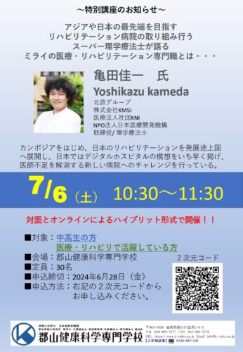資料請求 お問い合わせ アクセス 日本語を学びたい方へ 在校生の方へ 卒業生の方へ 採用ご担当の方へ 入札情報について 保護者の方へ 学校案内Introduction 郡山健康科学専門学校について 学校概要 学校長挨拶 本校の特長 沿革 アクセス SDGsへの取り組み 学校案内 施設案内 国際交流センター 生涯学習センター 情報公開・学校報 学校基本情報 学校報 学科紹介Department 入学案内Admission オープンキャンパス等 オープンキャンパス 学校見学・進路相談 入試・選考 入学試験について 募集要項 学費・奨学金について 学費について 奨学金について その他支援制度等 社会人・高卒既卒者向け支援制度 職業実践専門課程 よくあるご質問 キャンパスライフCampus life キャンパスカレンダー 在校生の一日 寮生 自宅生 再進学者 サポート 学生寮 スクールバス 資格・就職License,Carrier 就職実績 国家試験合格率 東都VoiceVoice 学校長挨拶 先輩たちのVoice! 教員紹介 関連施設Related facilities 関連施設 キース鍼灸接骨院 キッズ東都学園保育園 わんぱく東都学園児童発達支援事業所・放課後等デイサービス事業所 にじいろ東都学園ユーススクール 介護職員初任者研修・介護職員実務者研修 つくば開成高等学校 郡山校 リンク集 こども未来学科 介護福祉学科 メディカルスポーツ柔道整復学科 作業療法学科 理学療法学科 日本語学科 国際日本語学科 学校案内 ▶ 学校概要 ▶ 学校長挨拶 ▶ 本校の特長 ▶ 沿革 ▶ アクセス ▶ SDGsへの取り組み ▶ 施設案内 ▶ 国際交流センター ▶ 生涯学習センター ▶ 学校基本情報 ▶ 学校報 入学案内 ▶ オープンキャンパス ▶ 学校見学・進路相談 ▶ 入学試験について ▶ 募集要項 ▶ 学費について ▶ 奨学金について ▶ 保護者の方へ ▶ 社会人・高校既卒者向け支援制度 ▶ 職業実践専門課程 ▶ よくあるご質問 キャンパスライフ ▶ キャンパスカレンダー ▶ 在校生の1日 ▶ 学生サポート ▶ 学生寮 ▶ スクールバス 資格・就職 ▶ 就職実績 ▶ 国家試験合格率 東都Voice ▶ 先輩たちのVoice! ▶ 教員紹介 関連施設 ▶ キース鍼灸接骨院 ▶ キッズ東都学園保育園 ▶ わんぱく東都学園児童発達支援事業所・放課後等デイサービス事業所 ▶ にじいろ東都学園ユーススクール ▶ 介護職員初任者研修/実務者研修 ▶ つくば開成高等学校 郡山校 お知らせ ▶ 新着情報 ▶ トピックス 学校基本情報 │ プライバシーポリシー ソーシャルメディアポリシー │ リンク集 サイトマップ │ 教職員採用情報 文部科学省委託事業 本学全体の最新情報をお届けしますお知らせ 2024.06.19 7月6日 イベントチラシ 一般の方向け(医療・リハビリで活躍している方) < 前へ 一覧に戻る 新着記事 2025.07.14 求人情報を更新しました。 2025.11.01 第8回まんまーる東都学園こども食堂 2025.10.06 11月-進学イベントのご案内 2025.10.04 第7回まんまーる東都学園こども食堂 2025.09.27 【重要】募集要項の一部訂正について 2025.09.18 第59回 ハートフルサタデーに出展しました