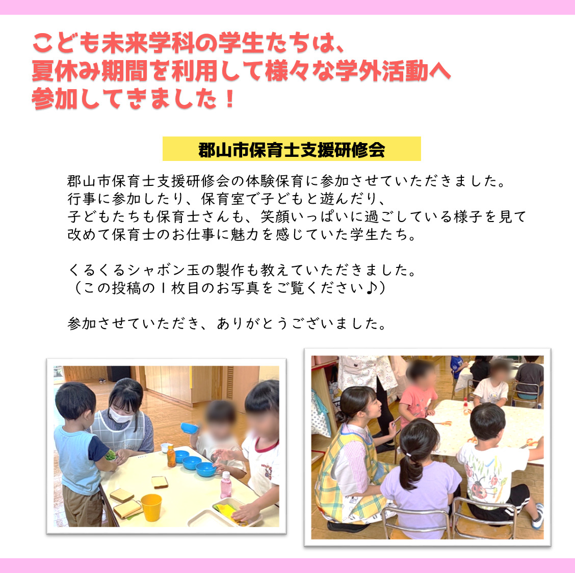 資料請求 お問い合わせ アクセス 日本語を学びたい方へ 在校生の方へ 卒業生の方へ 採用ご担当の方へ 入札情報について 保護者の方へ 学校案内Introduction 郡山健康科学専門学校について 学校概要 学校長挨拶 本校の特長 沿革 アクセス SDGsへの取り組み 学校案内 施設案内 国際交流センター 生涯学習センター 情報公開・学校報 学校基本情報 学校報 学科紹介Department 入学案内Admission オープンキャンパス等 オープンキャンパス 学校見学・進路相談 入試・選考 入学試験について 募集要項 学費・奨学金について 学費について 奨学金について その他支援制度等 社会人・高卒既卒者向け支援制度 職業実践専門課程 よくあるご質問 キャンパスライフCampus life キャンパスカレンダー 在校生の一日 寮生 自宅生 再進学者 サポート 学生寮 スクールバス 資格・就職License,Carrier 就職実績 国家試験合格率 東都VoiceVoice 学校長挨拶 先輩たちのVoice! 教員紹介 関連施設Related facilities 関連施設 キース鍼灸接骨院 キッズ東都学園保育園 わんぱく東都学園児童発達支援事業所・放課後等デイサービス事業所 にじいろ東都学園フリースクール 介護職員初任者研修・介護職員実務者研修 つくば開成高等学校 郡山校 リンク集 こども未来学科 介護福祉学科 メディカルスポーツ柔道整復学科 作業療法学科 理学療法学科 日本語学科 国際日本語学科 学校案内 ▶ 学校概要 ▶ 学校長挨拶 ▶ 本校の特長 ▶ 沿革 ▶ アクセス ▶ SDGsへの取り組み ▶ 施設案内 ▶ 国際交流センター ▶ 生涯学習センター ▶ 学校基本情報 ▶ 学校報 入学案内 ▶ オープンキャンパス ▶ 学校見学・進路相談 ▶ 入学試験について ▶ 募集要項 ▶ 学費について ▶ 奨学金について ▶ 保護者の方へ ▶ 社会人・高校既卒者向け支援制度 ▶ 職業実践専門課程 ▶ よくあるご質問 キャンパスライフ ▶ キャンパスカレンダー ▶ 在校生の1日 ▶ 学生サポート ▶ 学生寮 ▶ スクールバス 資格・就職 ▶ 就職実績 ▶ 国家試験合格率 東都Voice ▶ 先輩たちのVoice! ▶ 教員紹介 関連施設 ▶ キース鍼灸接骨院 ▶ キッズ東都学園保育園 ▶ わんぱく東都学園児童発達支援事業所・放課後等デイサービス事業所 ▶ にじいろ東都学園フリースクール ▶ 介護職員初任者研修/実務者研修 ▶ つくば開成高等学校 郡山校 お知らせ ▶ 新着情報 ▶ トピックス 学校基本情報 │ プライバシーポリシー ソーシャルメディアポリシー │ リンク集 サイトマップ │ 教職員採用情報 文部科学省委託事業 本学全体の最新情報をお届けしますお知らせ 2025.10.02 (修正版)掲載記事➁ 学外活動 < 前へ 一覧に戻る 新着記事 2026.01.28 【重要】特別選抜入学試験(最終入試)の実施について 2025.07.14 求人情報を更新しました。 2026.03.13 休館のお知らせ 2026.03.09 令和8年3月25日(水)実施 フードパントリーのお知らせ(まんまーる東都学園こども食堂) 2026.03.07 第12回 まんまーる東都学園こども食堂 2026.02.23 令和8年2月25日(水)実施 フードパントリーのお知らせ(まんまーる東都学園こども食堂) 2026.02.10 フードパントリーのお知らせ(まんまーる東都学園こども食堂)