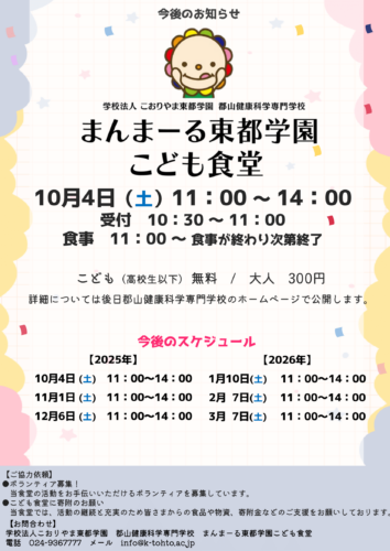資料請求 お問い合わせ アクセス 日本語を学びたい方へ 在校生の方へ 卒業生の方へ 採用ご担当の方へ 入札情報について 保護者の方へ 学校案内Introduction 郡山健康科学専門学校について 学校概要 学校長挨拶 本校の特長 沿革 アクセス SDGsへの取り組み 学校案内 施設案内 国際交流センター 生涯学習センター 情報公開・学校報 学校基本情報 学校報 学科紹介Department 入学案内Admission オープンキャンパス等 オープンキャンパス 学校見学・進路相談 入試・選考 入学試験について 募集要項 学費・奨学金について 学費について 奨学金について その他支援制度等 社会人・高卒既卒者向け支援制度 職業実践専門課程 よくあるご質問 キャンパスライフCampus life キャンパスカレンダー 在校生の一日 寮生 自宅生 再進学者 サポート 学生寮 スクールバス 資格・就職License,Carrier 就職実績 国家試験合格率 東都VoiceVoice 学校長挨拶 先輩たちのVoice! 教員紹介 関連施設Related facilities 関連施設 キース鍼灸接骨院 キッズ東都学園保育園 わんぱく東都学園児童発達支援事業所・放課後等デイサービス事業所 にじいろ東都学園フリースクール 介護職員初任者研修・介護職員実務者研修 つくば開成高等学校 郡山校 リンク集 こども未来学科 介護福祉学科 メディカルスポーツ柔道整復学科 作業療法学科 理学療法学科 日本語学科 国際日本語学科 学校案内 ▶ 学校概要 ▶ 学校長挨拶 ▶ 本校の特長 ▶ 沿革 ▶ アクセス ▶ SDGsへの取り組み ▶ 施設案内 ▶ 国際交流センター ▶ 生涯学習センター ▶ 学校基本情報 ▶ 学校報 入学案内 ▶ オープンキャンパス ▶ 学校見学・進路相談 ▶ 入学試験について ▶ 募集要項 ▶ 学費について ▶ 奨学金について ▶ 保護者の方へ ▶ 社会人・高校既卒者向け支援制度 ▶ 職業実践専門課程 ▶ よくあるご質問 キャンパスライフ ▶ キャンパスカレンダー ▶ 在校生の1日 ▶ 学生サポート ▶ 学生寮 ▶ スクールバス 資格・就職 ▶ 就職実績 ▶ 国家試験合格率 東都Voice ▶ 先輩たちのVoice! ▶ 教員紹介 関連施設 ▶ キース鍼灸接骨院 ▶ キッズ東都学園保育園 ▶ わんぱく東都学園児童発達支援事業所・放課後等デイサービス事業所 ▶ にじいろ東都学園フリースクール ▶ 介護職員初任者研修/実務者研修 ▶ つくば開成高等学校 郡山校 お知らせ ▶ 新着情報 ▶ トピックス 学校基本情報 │ プライバシーポリシー ソーシャルメディアポリシー │ リンク集 サイトマップ │ 教職員採用情報 文部科学省委託事業 本学全体の最新情報をお届けしますお知らせ 2025.08.06 0803kodosyoku-2 < 前へ 一覧に戻る 新着記事 2026.01.28 【重要】特別選抜入学試験(最終入試)の実施について 2025.07.14 求人情報を更新しました。 2026.03.07 第12回 まんまーる東都学園こども食堂 2026.02.23 令和8年2月25日(水)実施 フードパントリーのお知らせ(まんまーる東都学園こども食堂) 2026.02.10 フードパントリーのお知らせ(まんまーる東都学園こども食堂) 2026.02.08 【令和8年4月入学、まだ間に合います!】3月-進学イベントのご案内 2026.02.07 第11回 まんまーる東都学園こども食堂