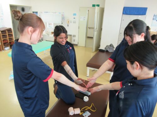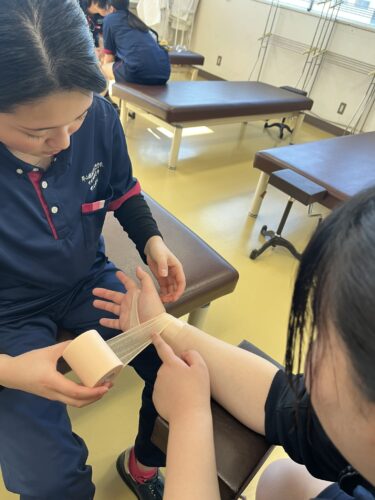 足首の捻挫など、介護施設でも実際に起こり得るケガの際に注意するポイントなどを教えていただき、テーピングによる固定方法についてクラスメイトを対象に実践しました。