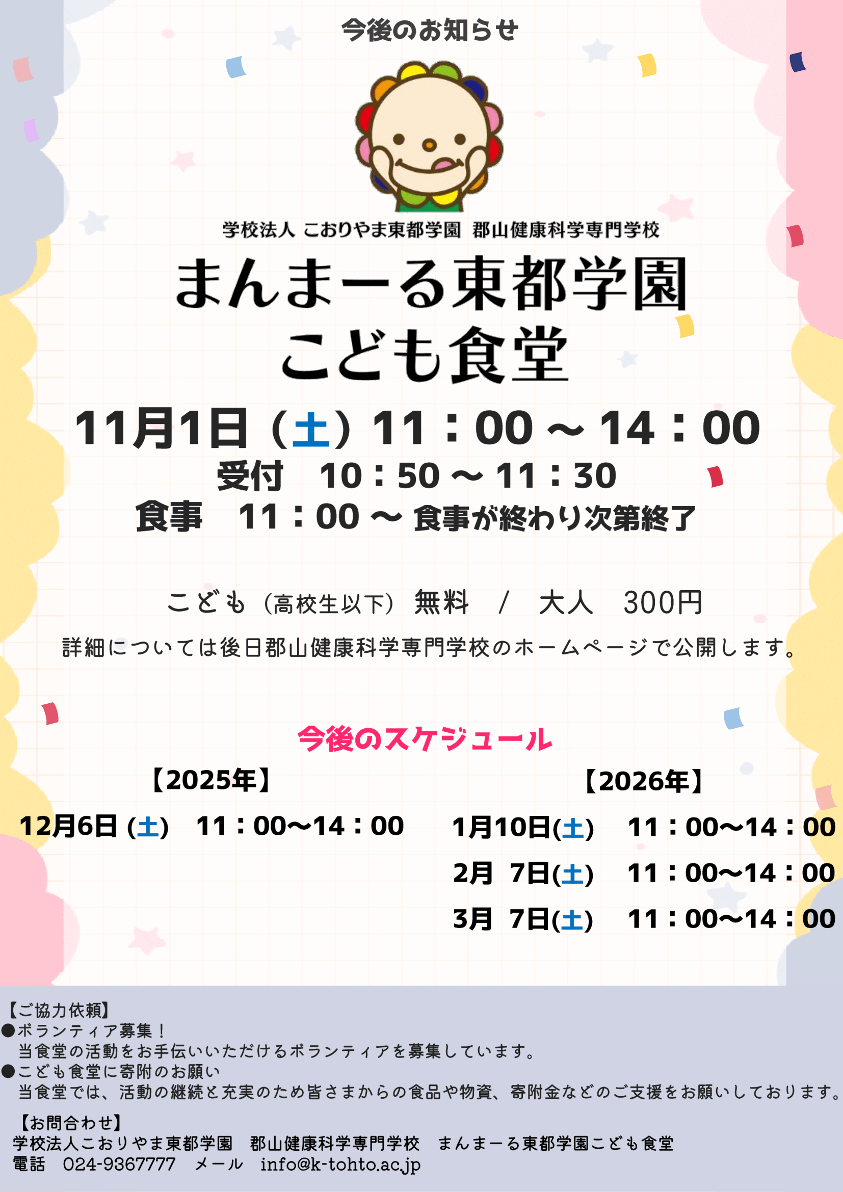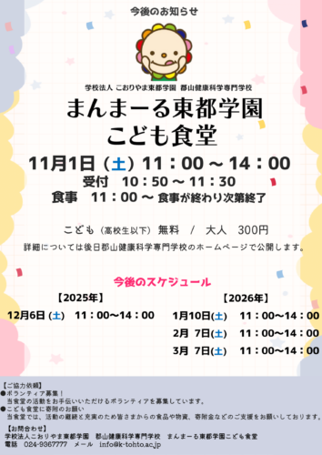 資料請求 お問い合わせ アクセス 日本語を学びたい方へ 在校生の方へ 卒業生の方へ 採用ご担当の方へ 入札情報について 保護者の方へ 学校案内Introduction 郡山健康科学専門学校について 学校概要 学校長挨拶 本校の特長 沿革 アクセス SDGsへの取り組み 学校案内 施設案内 国際交流センター 生涯学習センター 情報公開・学校報 学校基本情報 学校報 学科紹介Department 入学案内Admission オープンキャンパス等 オープンキャンパス 学校見学・進路相談 入試・選考 入学試験について 募集要項 学費・奨学金について 学費について 奨学金について その他支援制度等 社会人・高卒既卒者向け支援制度 職業実践専門課程 よくあるご質問 キャンパスライフCampus life キャンパスカレンダー 在校生の一日 寮生 自宅生 再進学者 サポート 学生寮 スクールバス 資格・就職License,Carrier 就職実績 国家試験合格率 東都VoiceVoice 学校長挨拶 先輩たちのVoice! 教員紹介 関連施設Related facilities 関連施設 キース鍼灸接骨院 キッズ東都学園保育園 わんぱく東都学園児童発達支援事業所・放課後等デイサービス事業所 にじいろ東都学園フリースクール 介護職員初任者研修・介護職員実務者研修 つくば開成高等学校 郡山校 リンク集 こども未来学科 介護福祉学科 メディカルスポーツ柔道整復学科 作業療法学科 理学療法学科 日本語学科 国際日本語学科 学校案内 ▶ 学校概要 ▶ 学校長挨拶 ▶ 本校の特長 ▶ 沿革 ▶ アクセス ▶ SDGsへの取り組み ▶ 施設案内 ▶ 国際交流センター ▶ 生涯学習センター ▶ 学校基本情報 ▶ 学校報 入学案内 ▶ オープンキャンパス ▶ 学校見学・進路相談 ▶ 入学試験について ▶ 募集要項 ▶ 学費について ▶ 奨学金について ▶ 保護者の方へ ▶ 社会人・高校既卒者向け支援制度 ▶ 職業実践専門課程 ▶ よくあるご質問 キャンパスライフ ▶ キャンパスカレンダー ▶ 在校生の1日 ▶ 学生サポート ▶ 学生寮 ▶ スクールバス 資格・就職 ▶ 就職実績 ▶ 国家試験合格率 東都Voice ▶ 先輩たちのVoice! ▶ 教員紹介 関連施設 ▶ キース鍼灸接骨院 ▶ キッズ東都学園保育園 ▶ わんぱく東都学園児童発達支援事業所・放課後等デイサービス事業所 ▶ にじいろ東都学園フリースクール ▶ 介護職員初任者研修/実務者研修 ▶ つくば開成高等学校 郡山校 お知らせ ▶ 新着情報 ▶ トピックス 学校基本情報 │ プライバシーポリシー ソーシャルメディアポリシー │ リンク集 サイトマップ │ 教職員採用情報 文部科学省委託事業 本学全体の最新情報をお届けしますお知らせ 2025.09.19 1004kodosyoku-2 < 前へ 一覧に戻る 新着記事 2026.01.28 【重要】特別選抜入学試験(最終入試)の実施について 2025.07.14 求人情報を更新しました。 2026.03.13 休館のお知らせ 2026.03.09 令和8年3月25日(水)実施 フードパントリーのお知らせ(まんまーる東都学園こども食堂) 2026.03.07 第12回 まんまーる東都学園こども食堂 2026.02.23 令和8年2月25日(水)実施 フードパントリーのお知らせ(まんまーる東都学園こども食堂) 2026.02.10 フードパントリーのお知らせ(まんまーる東都学園こども食堂)