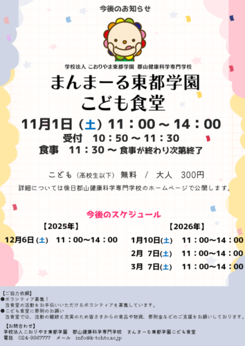 資料請求 お問い合わせ アクセス 日本語を学びたい方へ 在校生の方へ 卒業生の方へ 採用ご担当の方へ 入札情報について 保護者の方へ 学校案内Introduction 郡山健康科学専門学校について 学校概要 学校長挨拶 本校の特長 沿革 アクセス SDGsへの取り組み 学校案内 施設案内 国際交流センター 生涯学習センター 情報公開・学校報 学校基本情報 学校報 学科紹介Department 入学案内Admission オープンキャンパス等 オープンキャンパス 学校見学・進路相談 入試・選考 入学試験について 募集要項 学費・奨学金について 学費について 奨学金について その他支援制度等 社会人・高卒既卒者向け支援制度 職業実践専門課程 よくあるご質問 キャンパスライフCampus life キャンパスカレンダー 在校生の一日 寮生 自宅生 再進学者 サポート 学生寮 スクールバス 資格・就職License,Carrier 就職実績 国家試験合格率 東都VoiceVoice 学校長挨拶 先輩たちのVoice! 教員紹介 関連施設Related facilities 関連施設 キース鍼灸接骨院 キッズ東都学園保育園 わんぱく東都学園児童発達支援事業所・放課後等デイサービス事業所 にじいろ東都学園ユーススクール 介護職員初任者研修・介護職員実務者研修 つくば開成高等学校 郡山校 リンク集 こども未来学科 介護福祉学科 メディカルスポーツ柔道整復学科 作業療法学科 理学療法学科 日本語学科 国際日本語学科 学校案内 ▶ 学校概要 ▶ 学校長挨拶 ▶ 本校の特長 ▶ 沿革 ▶ アクセス ▶ SDGsへの取り組み ▶ 施設案内 ▶ 国際交流センター ▶ 生涯学習センター ▶ 学校基本情報 ▶ 学校報 入学案内 ▶ オープンキャンパス ▶ 学校見学・進路相談 ▶ 入学試験について ▶ 募集要項 ▶ 学費について ▶ 奨学金について ▶ 保護者の方へ ▶ 社会人・高校既卒者向け支援制度 ▶ 職業実践専門課程 ▶ よくあるご質問 キャンパスライフ ▶ キャンパスカレンダー ▶ 在校生の1日 ▶ 学生サポート ▶ 学生寮 ▶ スクールバス 資格・就職 ▶ 就職実績 ▶ 国家試験合格率 東都Voice ▶ 先輩たちのVoice! ▶ 教員紹介 関連施設 ▶ キース鍼灸接骨院 ▶ キッズ東都学園保育園 ▶ わんぱく東都学園児童発達支援事業所・放課後等デイサービス事業所 ▶ にじいろ東都学園ユーススクール ▶ 介護職員初任者研修/実務者研修 ▶ つくば開成高等学校 郡山校 お知らせ ▶ 新着情報 ▶ トピックス 学校基本情報 │ プライバシーポリシー ソーシャルメディアポリシー │ リンク集 サイトマップ │ 教職員採用情報 文部科学省委託事業 本学全体の最新情報をお届けしますお知らせ 2025.09.19 1004kodosyoku-2 < 前へ 一覧に戻る 新着記事 2025.07.14 求人情報を更新しました。 2025.11.01 第8回まんまーる東都学園こども食堂 2025.10.06 11月-進学イベントのご案内 2025.10.04 第7回まんまーる東都学園こども食堂 2025.09.27 【重要】募集要項の一部訂正について 2025.09.18 第59回 ハートフルサタデーに出展しました