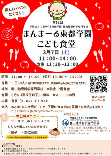資料請求 お問い合わせ アクセス 日本語を学びたい方へ 在校生の方へ 卒業生の方へ 採用ご担当の方へ 入札情報について 保護者の方へ 学校案内Introduction 郡山健康科学専門学校について 学校概要 学校長挨拶 本校の特長 沿革 アクセス SDGsへの取り組み 学校案内 施設案内 国際交流センター 生涯学習センター 情報公開・学校報 学校基本情報 学校報 学科紹介Department 入学案内Admission オープンキャンパス等 オープンキャンパス 学校見学・進路相談 入試・選考 入学試験について 募集要項 学費・奨学金について 学費について 奨学金について その他支援制度等 社会人・高卒既卒者向け支援制度 職業実践専門課程 よくあるご質問 キャンパスライフCampus life キャンパスカレンダー 在校生の一日 寮生 自宅生 再進学者 サポート 学生寮 スクールバス 資格・就職License,Carrier 就職実績 国家試験合格率 東都VoiceVoice 学校長挨拶 先輩たちのVoice! 教員紹介 関連施設Related facilities 関連施設 キース鍼灸接骨院 キッズ東都学園保育園 わんぱく東都学園児童発達支援事業所・放課後等デイサービス事業所 にじいろ東都学園フリースクール 介護職員初任者研修・介護職員実務者研修 つくば開成高等学校 郡山校 リンク集 こども未来学科 介護福祉学科 メディカルスポーツ柔道整復学科 作業療法学科 理学療法学科 日本語学科 国際日本語学科 学校案内 ▶ 学校概要 ▶ 学校長挨拶 ▶ 本校の特長 ▶ 沿革 ▶ アクセス ▶ SDGsへの取り組み ▶ 施設案内 ▶ 国際交流センター ▶ 生涯学習センター ▶ 学校基本情報 ▶ 学校報 入学案内 ▶ オープンキャンパス ▶ 学校見学・進路相談 ▶ 入学試験について ▶ 募集要項 ▶ 学費について ▶ 奨学金について ▶ 保護者の方へ ▶ 社会人・高校既卒者向け支援制度 ▶ 職業実践専門課程 ▶ よくあるご質問 キャンパスライフ ▶ キャンパスカレンダー ▶ 在校生の1日 ▶ 学生サポート ▶ 学生寮 ▶ スクールバス 資格・就職 ▶ 就職実績 ▶ 国家試験合格率 東都Voice ▶ 先輩たちのVoice! ▶ 教員紹介 関連施設 ▶ キース鍼灸接骨院 ▶ キッズ東都学園保育園 ▶ わんぱく東都学園児童発達支援事業所・放課後等デイサービス事業所 ▶ にじいろ東都学園フリースクール ▶ 介護職員初任者研修/実務者研修 ▶ つくば開成高等学校 郡山校 お知らせ ▶ 新着情報 ▶ トピックス 学校基本情報 │ プライバシーポリシー ソーシャルメディアポリシー │ リンク集 サイトマップ │ 教職員採用情報 文部科学省委託事業 本学全体の最新情報をお届けしますお知らせ 2026.02.18 スライド1 < 前へ 一覧に戻る 新着記事 2025.07.14 求人情報を更新しました。 2026.04.14 第13回まんまーる東都学園こども食堂 2026.03.25 HARUNAさんとSHIONさんとの運動遊び! 2026.03.24 4月-進学イベントのご案内 2026.03.09 令和8年3月25日(水)実施 フードパントリーのお知らせ(まんまーる東都学園こども食堂) 2026.03.07 第12回 まんまーる東都学園こども食堂