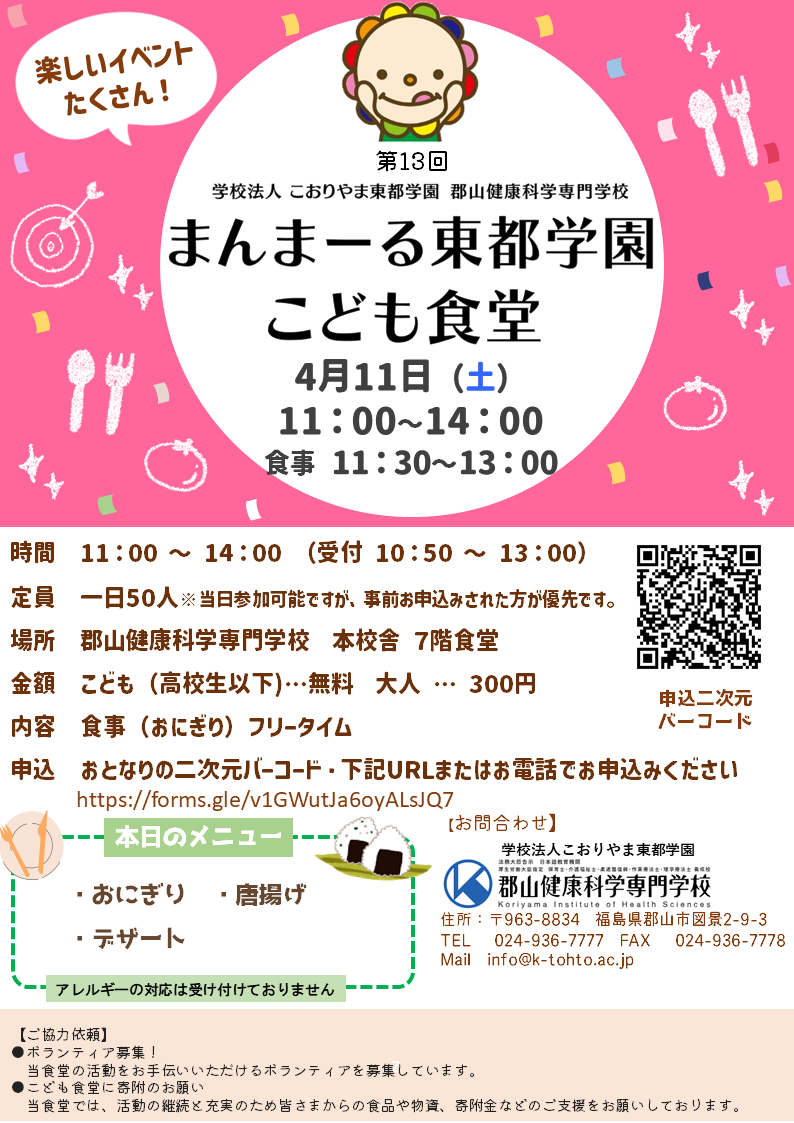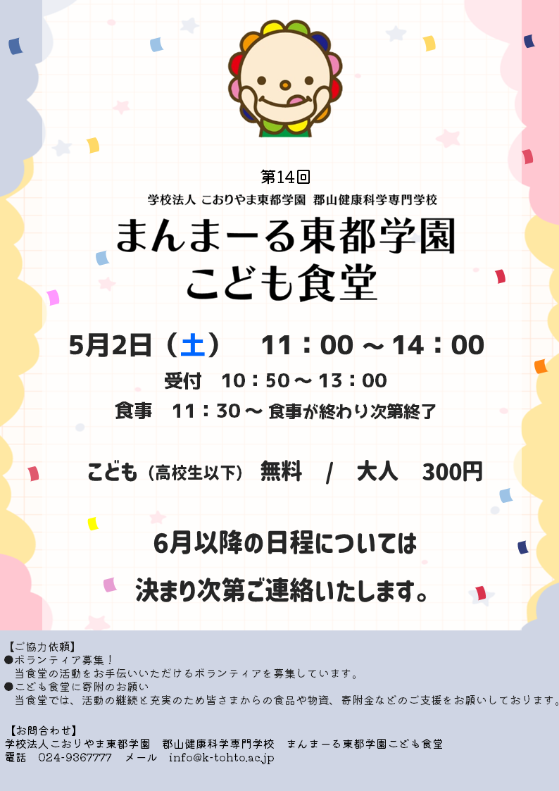 次回 第13回まんまーる東都学園こども食堂について、以下の通りお知らせいたします。