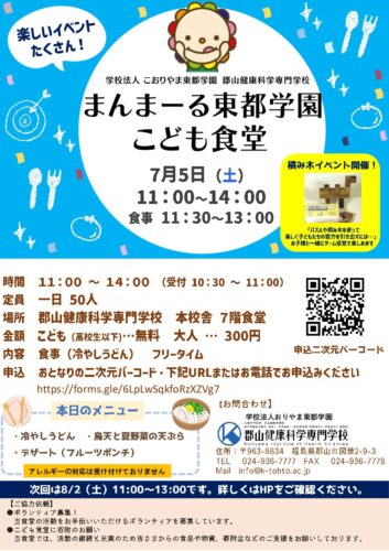 資料請求 お問い合わせ アクセス 日本語を学びたい方へ 在校生の方へ 卒業生の方へ 採用ご担当の方へ 入札情報について 保護者の方へ 学校案内Introduction 郡山健康科学専門学校について 学校概要 学校長挨拶 本校の特長 沿革 アクセス SDGsへの取り組み 学校案内 施設案内 国際交流センター 生涯学習センター 情報公開・学校報 学校基本情報 学校報 学科紹介Department 入学案内Admission オープンキャンパス等 オープンキャンパス 学校見学・進路相談 入試・選考 入学試験について 募集要項 学費・奨学金について 学費について 奨学金について その他支援制度等 社会人・高卒既卒者向け支援制度 職業実践専門課程 よくあるご質問 キャンパスライフCampus life キャンパスカレンダー 在校生の一日 寮生 自宅生 再進学者 サポート 学生寮 スクールバス 資格・就職License,Carrier 就職実績 国家試験合格率 東都VoiceVoice 学校長挨拶 先輩たちのVoice! 教員紹介 関連施設Related facilities 関連施設 キース鍼灸接骨院 キッズ東都学園保育園 わんぱく東都学園児童発達支援事業所・放課後等デイサービス事業所 にじいろ東都学園フリースクール 介護職員初任者研修・介護職員実務者研修 つくば開成高等学校 郡山校 リンク集 こども未来学科 介護福祉学科 メディカルスポーツ柔道整復学科 作業療法学科 理学療法学科 日本語学科 国際日本語学科 学校案内 ▶ 学校概要 ▶ 学校長挨拶 ▶ 本校の特長 ▶ 沿革 ▶ アクセス ▶ SDGsへの取り組み ▶ 施設案内 ▶ 国際交流センター ▶ 生涯学習センター ▶ 学校基本情報 ▶ 学校報 入学案内 ▶ オープンキャンパス ▶ 学校見学・進路相談 ▶ 入学試験について ▶ 募集要項 ▶ 学費について ▶ 奨学金について ▶ 保護者の方へ ▶ 社会人・高校既卒者向け支援制度 ▶ 職業実践専門課程 ▶ よくあるご質問 キャンパスライフ ▶ キャンパスカレンダー ▶ 在校生の1日 ▶ 学生サポート ▶ 学生寮 ▶ スクールバス 資格・就職 ▶ 就職実績 ▶ 国家試験合格率 東都Voice ▶ 先輩たちのVoice! ▶ 教員紹介 関連施設 ▶ キース鍼灸接骨院 ▶ キッズ東都学園保育園 ▶ わんぱく東都学園児童発達支援事業所・放課後等デイサービス事業所 ▶ にじいろ東都学園フリースクール ▶ 介護職員初任者研修/実務者研修 ▶ つくば開成高等学校 郡山校 お知らせ ▶ 新着情報 ▶ トピックス 学校基本情報 │ プライバシーポリシー ソーシャルメディアポリシー │ リンク集 サイトマップ │ 教職員採用情報 文部科学省委託事業 本学全体の最新情報をお届けしますお知らせ 2025.06.19 0705kodosyoku(通常版) < 前へ 一覧に戻る 新着記事 2026.01.28 【重要】特別選抜入学試験(最終入試)の実施について 2025.07.14 求人情報を更新しました。 2026.03.07 第12回 まんまーる東都学園こども食堂 2026.02.23 令和8年2月25日(水)実施 フードパントリーのお知らせ(まんまーる東都学園こども食堂) 2026.02.10 フードパントリーのお知らせ(まんまーる東都学園こども食堂) 2026.02.08 【令和8年4月入学、まだ間に合います!】3月-進学イベントのご案内 2026.02.07 第11回 まんまーる東都学園こども食堂