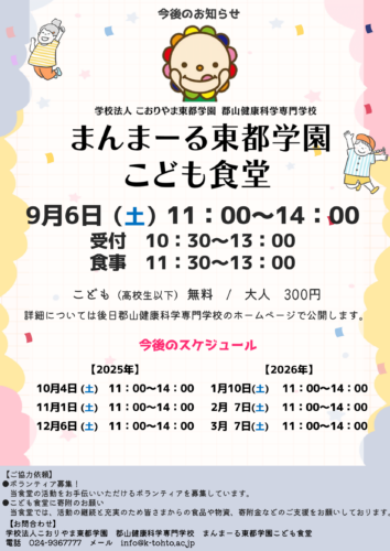 資料請求 お問い合わせ アクセス 日本語を学びたい方へ 在校生の方へ 卒業生の方へ 採用ご担当の方へ 入札情報について 保護者の方へ 学校案内Introduction 郡山健康科学専門学校について 学校概要 学校長挨拶 本校の特長 沿革 アクセス SDGsへの取り組み 学校案内 施設案内 国際交流センター 生涯学習センター 情報公開・学校報 学校基本情報 学校報 学科紹介Department 入学案内Admission オープンキャンパス等 オープンキャンパス 学校見学・進路相談 入試・選考 入学試験について 募集要項 学費・奨学金について 学費について 奨学金について その他支援制度等 社会人・高卒既卒者向け支援制度 職業実践専門課程 よくあるご質問 キャンパスライフCampus life キャンパスカレンダー 在校生の一日 寮生 自宅生 再進学者 サポート 学生寮 スクールバス 資格・就職License,Carrier 就職実績 国家試験合格率 東都VoiceVoice 学校長挨拶 先輩たちのVoice! 教員紹介 関連施設Related facilities 関連施設 キース鍼灸接骨院 キッズ東都学園保育園 わんぱく東都学園児童発達支援事業所・放課後等デイサービス事業所 にじいろ東都学園フリースクール 介護職員初任者研修・介護職員実務者研修 つくば開成高等学校 郡山校 リンク集 こども未来学科 介護福祉学科 メディカルスポーツ柔道整復学科 作業療法学科 理学療法学科 日本語学科 国際日本語学科 学校案内 ▶ 学校概要 ▶ 学校長挨拶 ▶ 本校の特長 ▶ 沿革 ▶ アクセス ▶ SDGsへの取り組み ▶ 施設案内 ▶ 国際交流センター ▶ 生涯学習センター ▶ 学校基本情報 ▶ 学校報 入学案内 ▶ オープンキャンパス ▶ 学校見学・進路相談 ▶ 入学試験について ▶ 募集要項 ▶ 学費について ▶ 奨学金について ▶ 保護者の方へ ▶ 社会人・高校既卒者向け支援制度 ▶ 職業実践専門課程 ▶ よくあるご質問 キャンパスライフ ▶ キャンパスカレンダー ▶ 在校生の1日 ▶ 学生サポート ▶ 学生寮 ▶ スクールバス 資格・就職 ▶ 就職実績 ▶ 国家試験合格率 東都Voice ▶ 先輩たちのVoice! ▶ 教員紹介 関連施設 ▶ キース鍼灸接骨院 ▶ キッズ東都学園保育園 ▶ わんぱく東都学園児童発達支援事業所・放課後等デイサービス事業所 ▶ にじいろ東都学園フリースクール ▶ 介護職員初任者研修/実務者研修 ▶ つくば開成高等学校 郡山校 お知らせ ▶ 新着情報 ▶ トピックス 学校基本情報 │ プライバシーポリシー ソーシャルメディアポリシー │ リンク集 サイトマップ │ 教職員採用情報 文部科学省委託事業 本学全体の最新情報をお届けしますお知らせ 2025.07.11 0802kodosyoku-2 < 前へ 一覧に戻る 新着記事 2026.01.28 【重要】特別選抜入学試験(最終入試)の実施について 2025.07.14 求人情報を更新しました。 2026.03.09 令和8年3月25日(水)実施 フードパントリーのお知らせ(まんまーる東都学園こども食堂) 2026.03.07 第12回 まんまーる東都学園こども食堂 2026.02.23 令和8年2月25日(水)実施 フードパントリーのお知らせ(まんまーる東都学園こども食堂) 2026.02.10 フードパントリーのお知らせ(まんまーる東都学園こども食堂) 2026.02.08 【令和8年4月入学、まだ間に合います!】3月-進学イベントのご案内